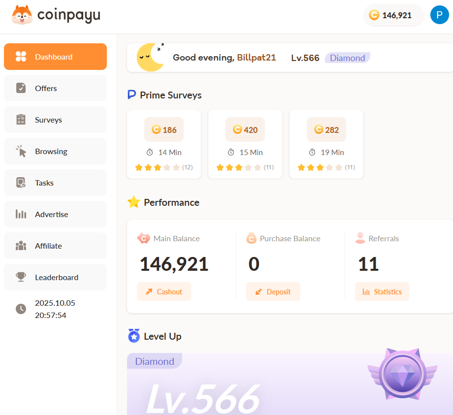 This is the main dashboard of Coinpayu. From here, users can access paid ads, surveys, and referral tools. Each ad pays a small amount of satoshis instantly. Surveys offer higher rewards but take more time.